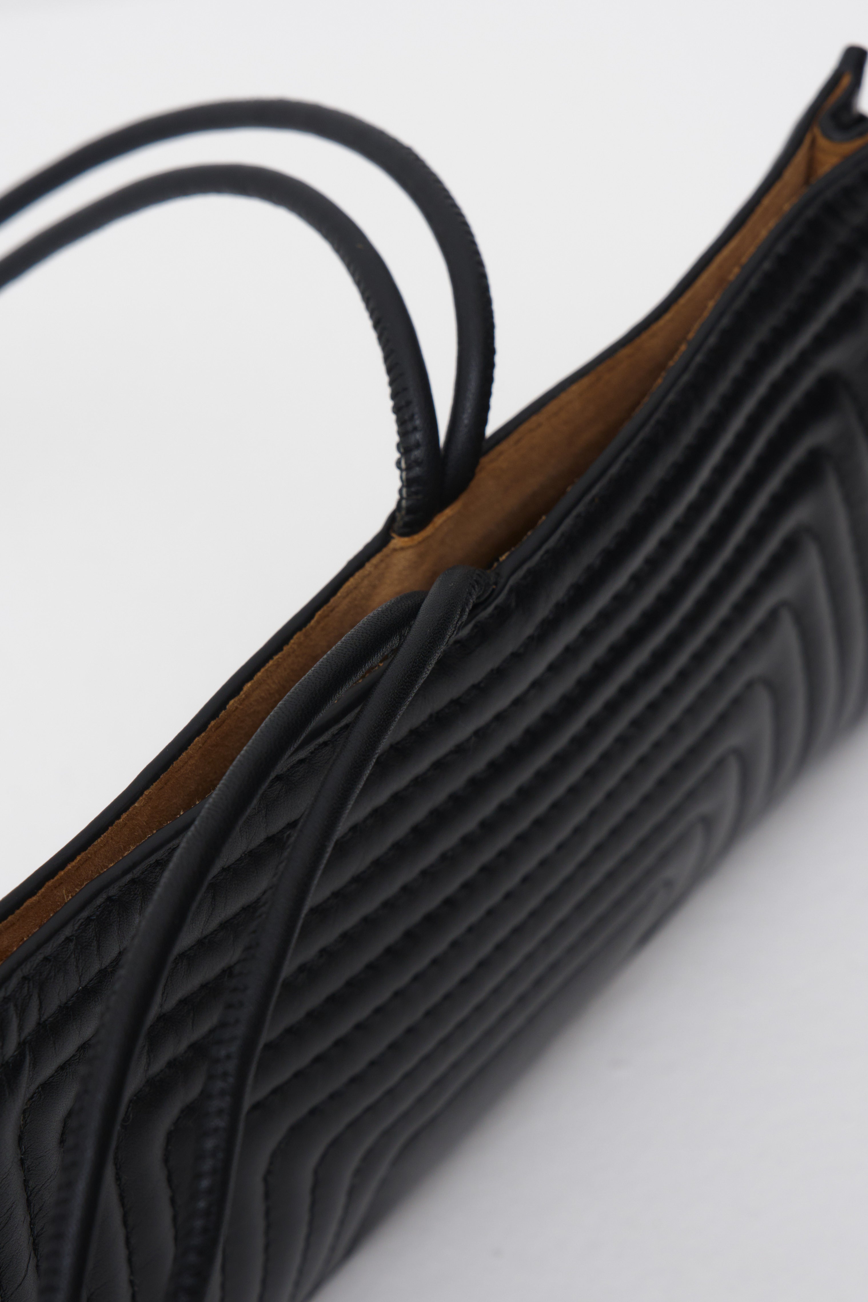 This crossbody bag is crafted in black Nappa leather with quilted detailing and a double cord strap. It features a magnetic snap closure, suede lining, and is finished with subtle tassel accents.