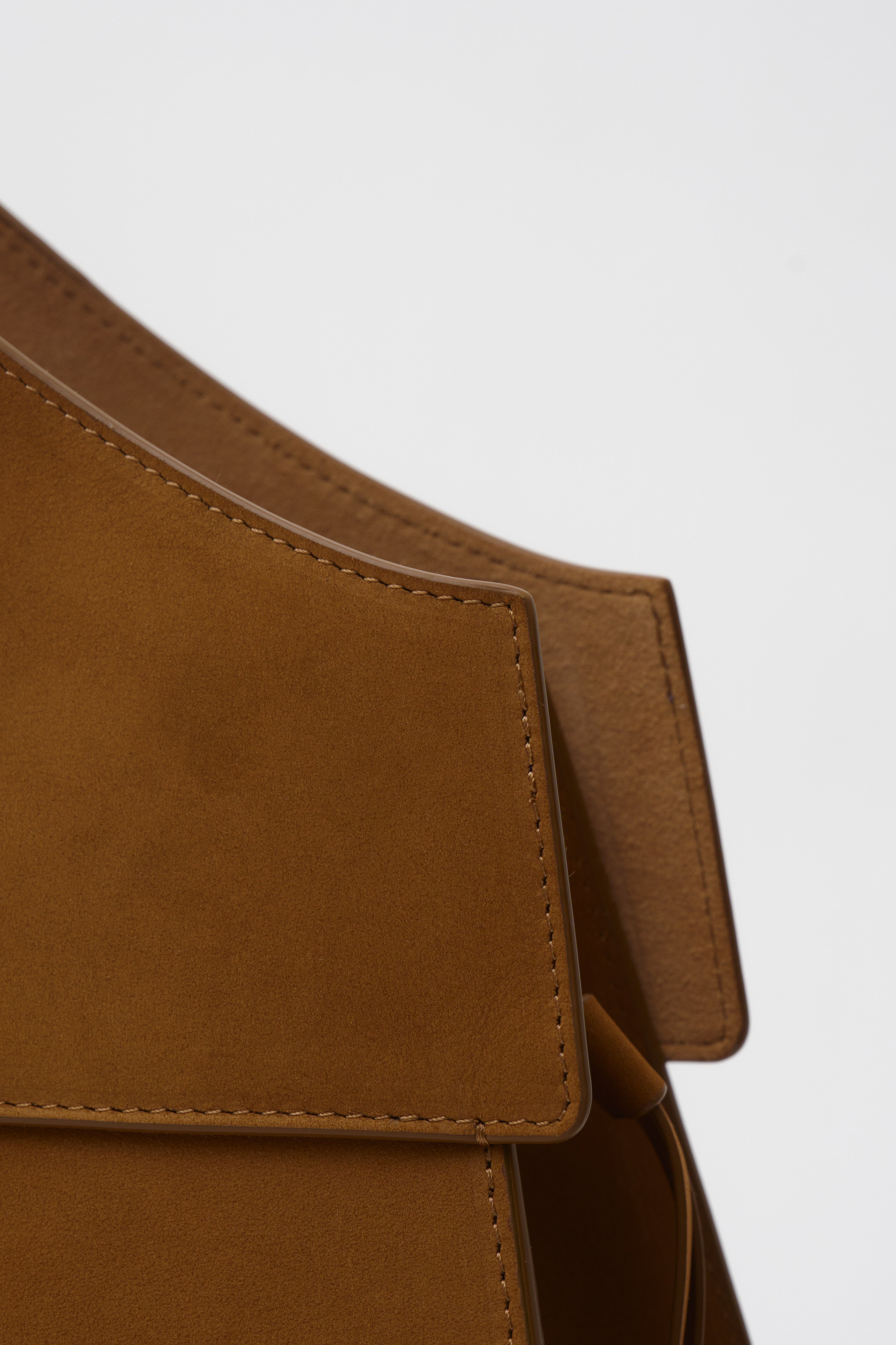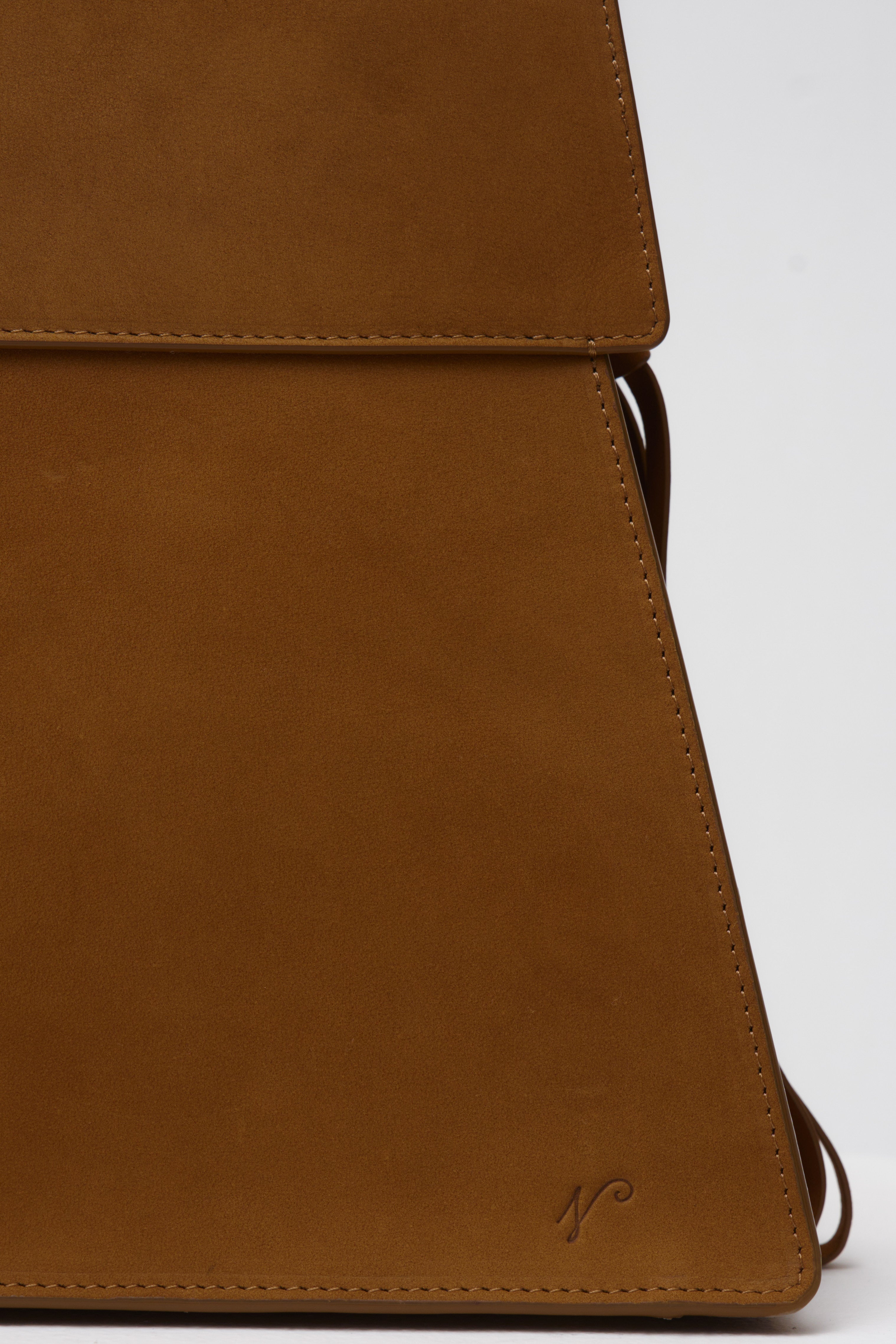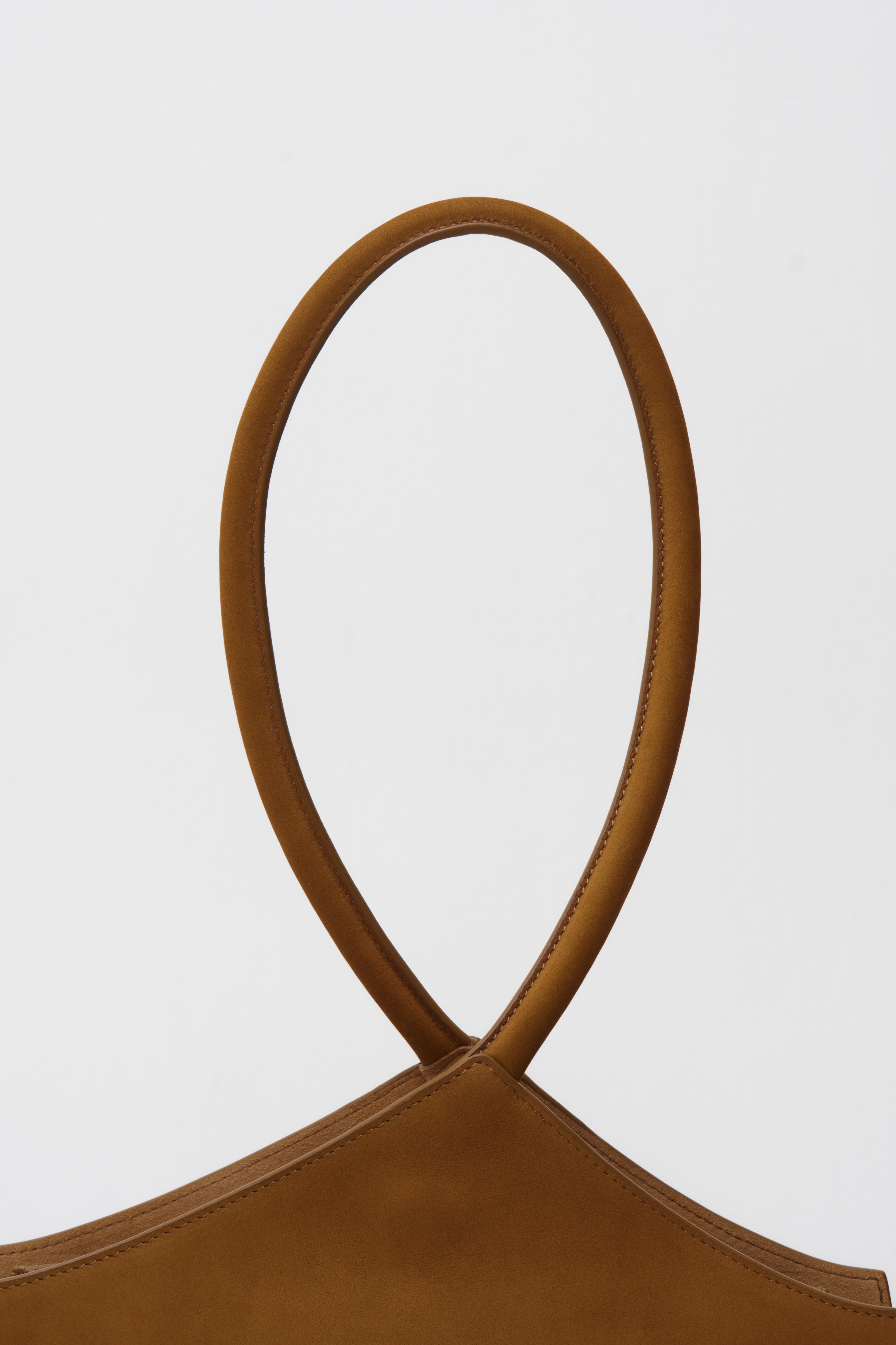 Our signature tote features a distinctive spiral handle and flap detailing, crafted in camel coloured suede with a suede lining. It includes a detachable inner pouch, an internal pocket, and is finished with gold-toned hardware and gusset detailing.