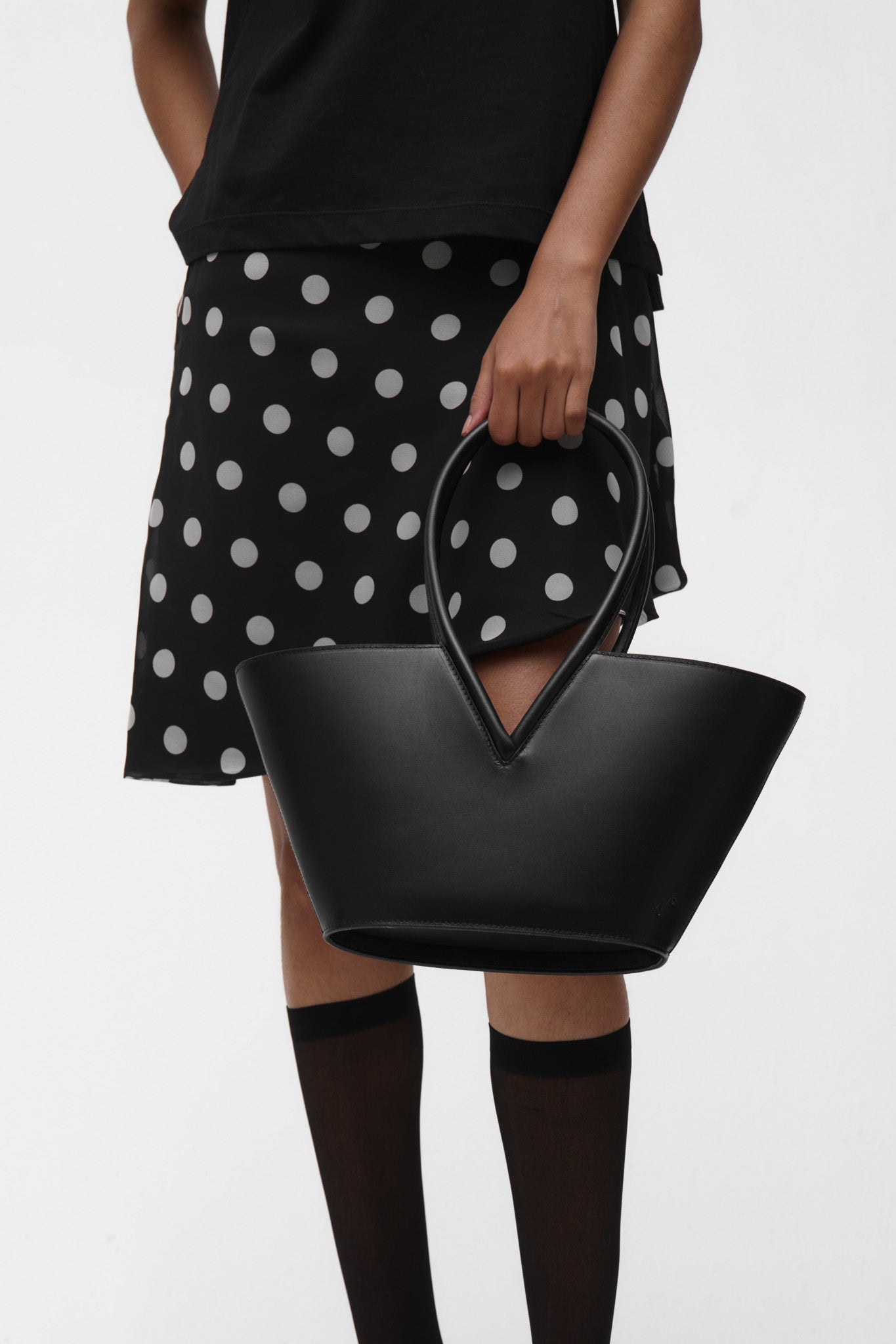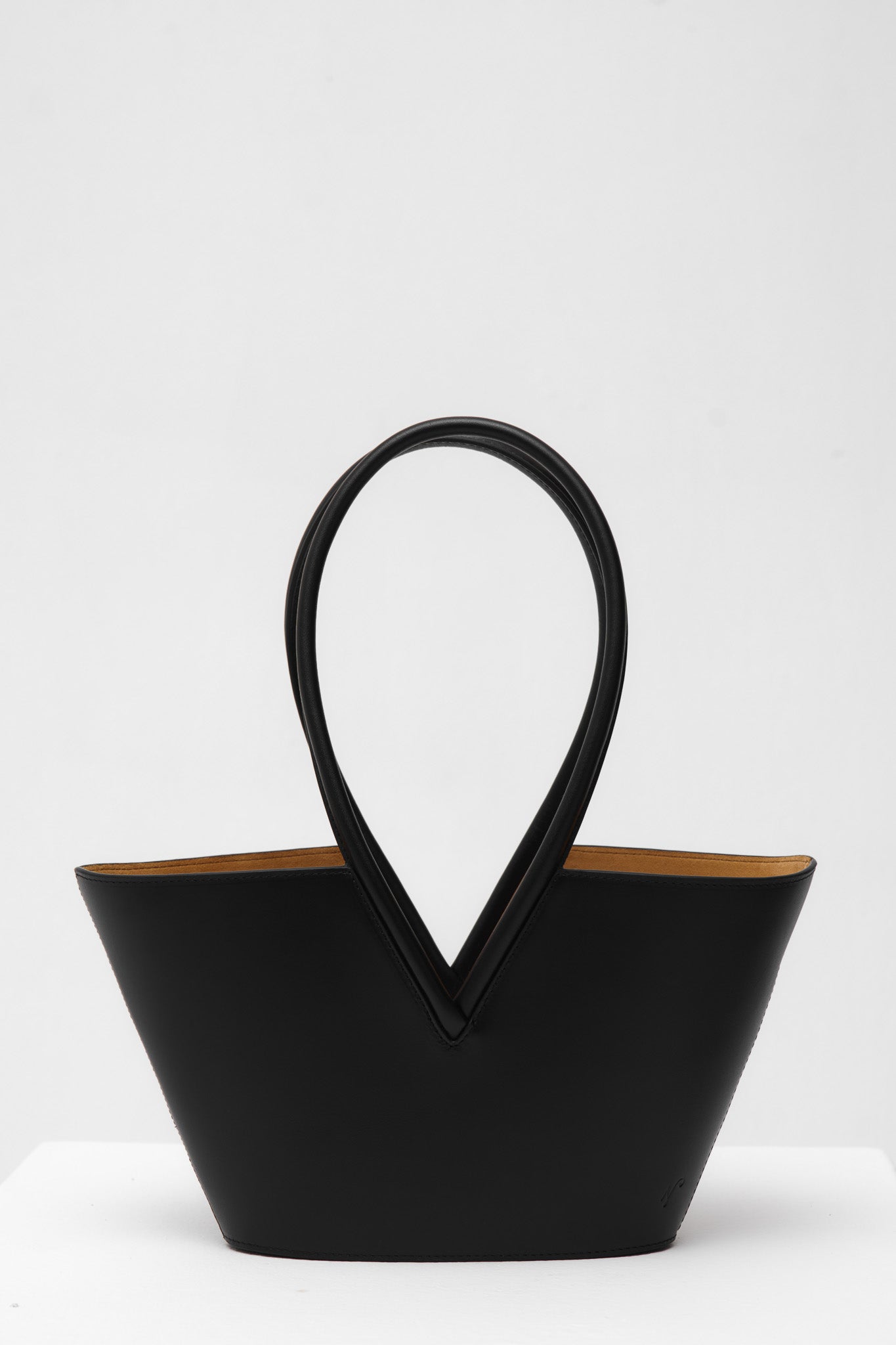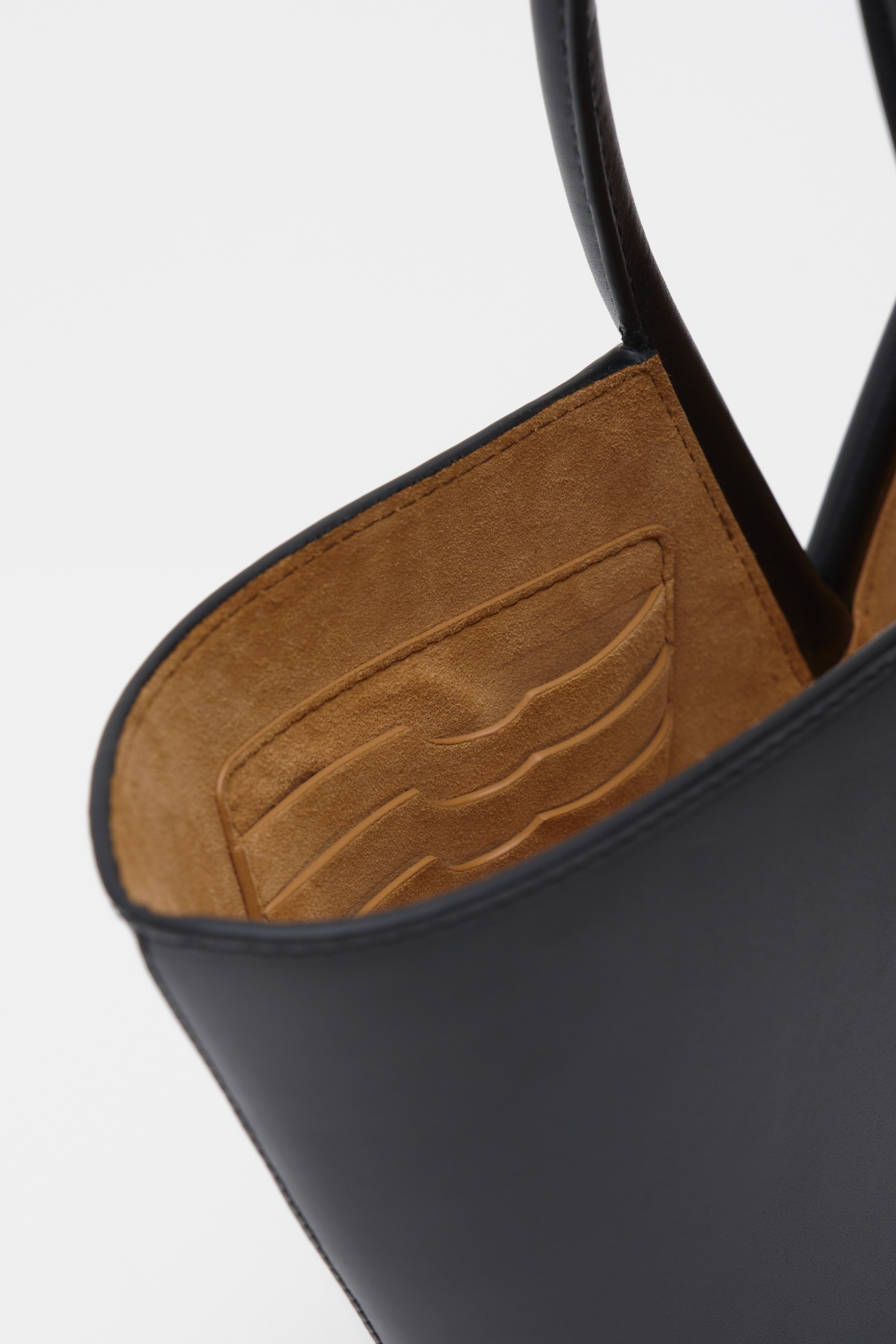 A basket shaped bag in black full grain leather with gold toned hardware, comfortable shoulder straps and suede lining. This bag comes with an inner card pocket and a detachable pouch.